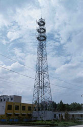 微波塔又稱為微波鐵塔、微波通信鐵塔,多建于地面、樓頂、山頂。微波塔承風(fēng)能力強(qiáng),塔架多采用角鋼材料輔以鋼板材料,也可全部采用鋼管材料組成,塔架各構(gòu)件之間采用螺栓連接,全部塔架構(gòu)件在加工完畢后經(jīng)過熱鍍鋅防腐處理。角鋼鐵塔由塔靴、塔身、避雷塔、避雷針、平臺、爬梯、天線支架、饋線架及避雷引下線等部件組成。 主要功能:支持電視信號發(fā)射.適用單位:各省市自治區(qū)廣播電視部門。